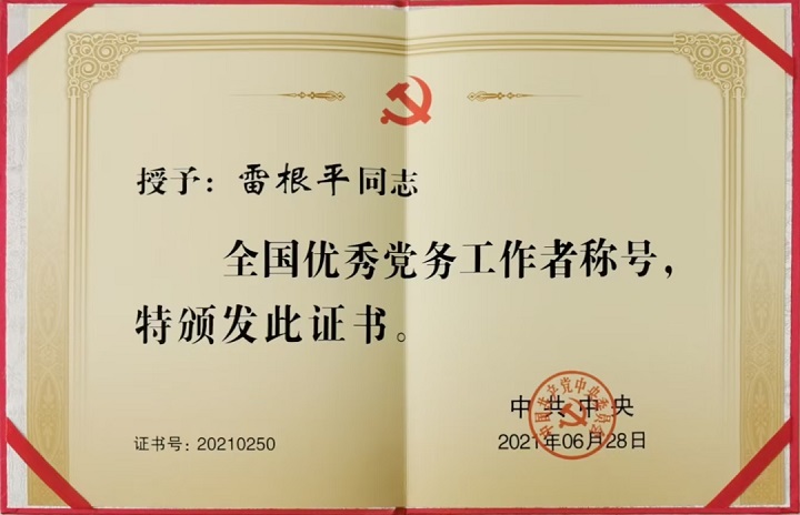 雷根平同志荣获全国优秀党务工作者
