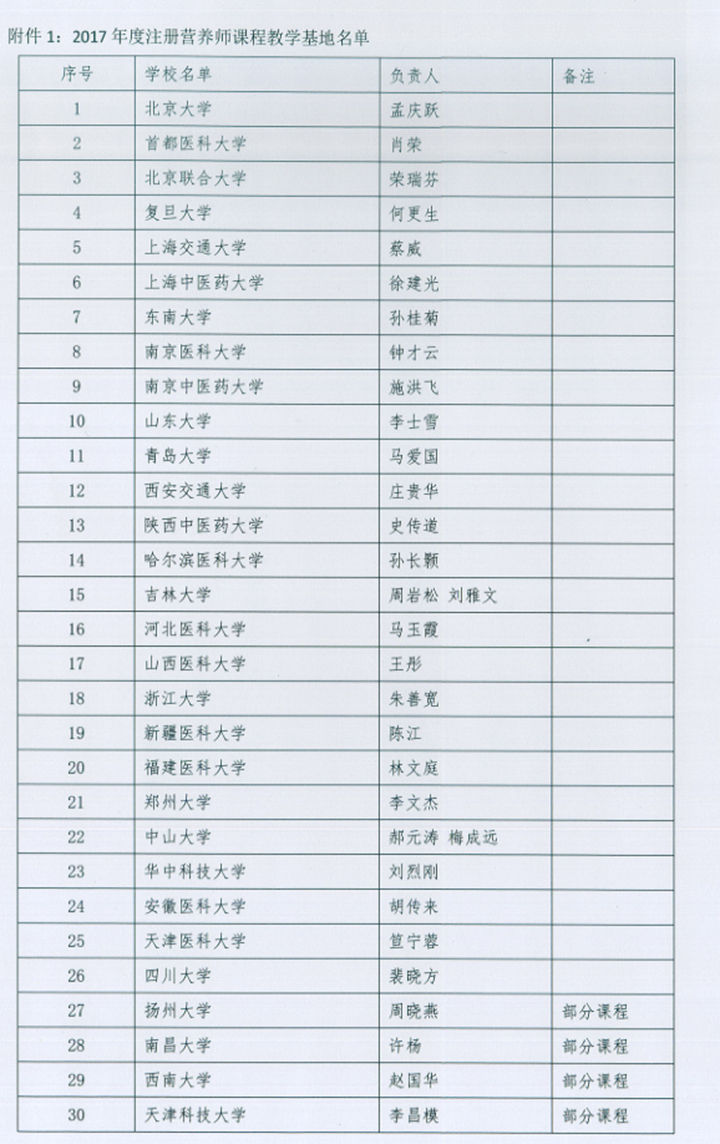 为加强注册营养师人才队伍建设,加快规范化培养的进程,中国营养学会在2017年8月组织开展了注册营养师课程教学基地申报工作。经单位申报、逐级审核、注册营养师工作委员会专家终审,确定批准陕西中医药大学在内的30所高校为注册营养师课程教学基地。