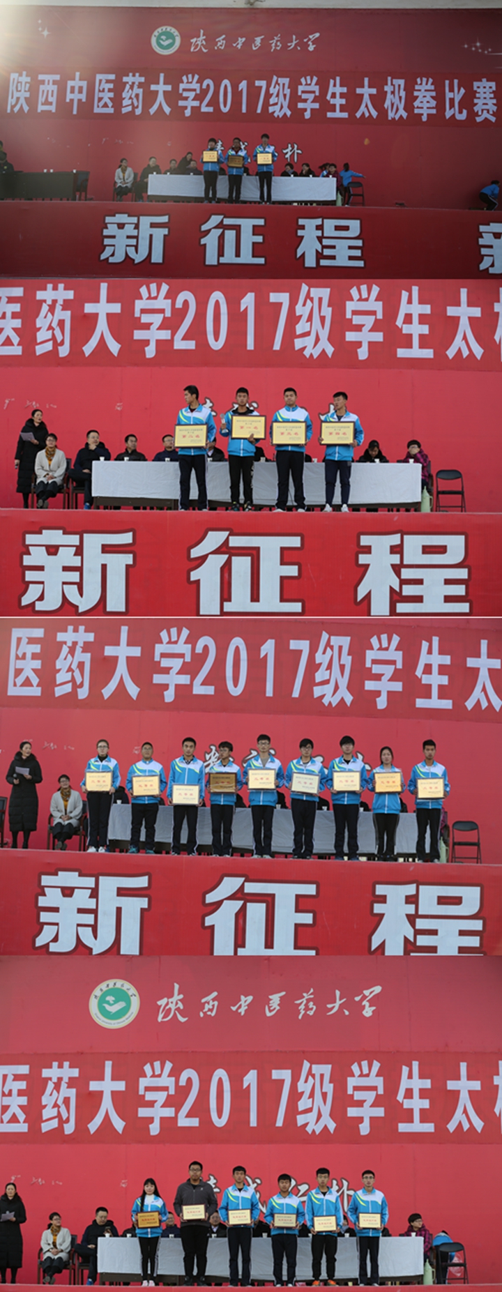 12月10日下午,陕西中医药大学2017级学生太极拳比赛圆满结束。本次比赛共有2017级9个院系52 个班参与,经过近两个小时的比赛,同学们精神饱满,服装统一,动作整齐地认真完成每一个动作。副校长王瑞辉、党校办、宣传部、教务处、团委等相关部门领导及各院系书记观看了比赛并为获奖班级颁发奖牌。颁奖仪式由体育部主任马学文教授主持,裁判长马科宣布比赛成绩,副校长王瑞辉做了讲话。他表示,太极拳是中华民族的优秀文化遗产,蕴含着丰富的中国古代哲学、养生、保健、康复思想,是人类共同的财富。它老少皆宜,已经成为当今社会全民健身和健康文化的新潮流,深受群众的喜爱,也是我校体育教学的必修课程和特色教学项目之一。每年一届的太极拳比赛,目的就是通过比赛,督促同学认真练习,掌握要领,在提高教学效果的同时,推动太极拳在我校的广泛开展,为终身体育服务。